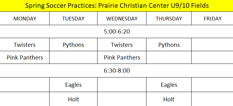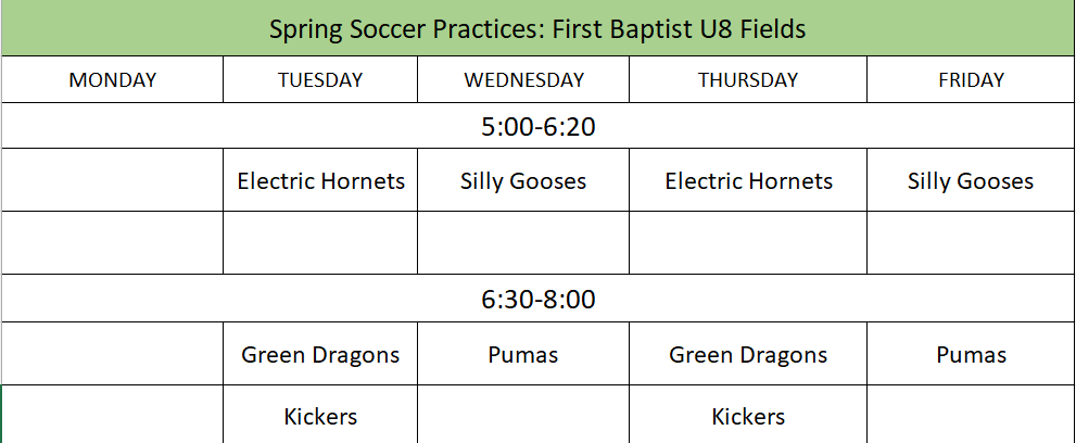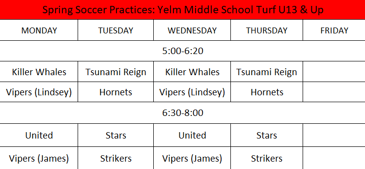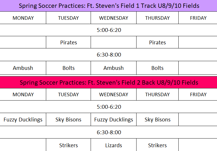 Spring 2026 Season - Practice Schedule